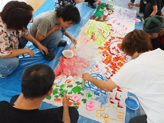 大きな白布を囲み、徳武社長(右側手前)と利用者様が共に筆を走らせる様子。そこには「企業と福祉」という垣根はなく、ただ純粋に表現を楽しむ、一人の人間同士の豊かな時間が流れていました。