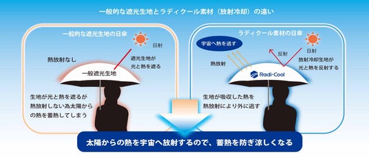 「Radi-Cool」は、電力などのエネルギーを使わず、受けた熱を効率よく外へ逃がすことで温度上昇を抑える放射冷却技術を応用した素材で、炎天下でも快適な使用感を実現します。