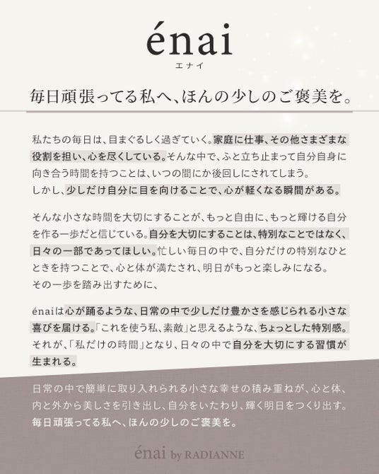 「enai(エナイ)」は、忙しい女性たちが自分らしさを引き出し、日常の中で簡単に取り入れられる美と健康を提供するブランドです。忙しいママ、働く女性、キャリア女性の「自分のための時間がない」という悩みに寄り添い、毎日頑張っている自分に「ほんの少しのご褒美」を届け、心と体が輝く未来を創ることを目指しています。