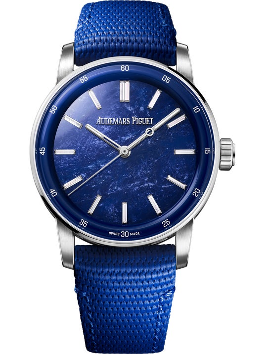 ソーダライトダイヤルのモデルは18K ホワイトゴールドケースを組み合わせ、バゲットカットダイヤモンドのアワーマーカーとホワイトゴールドの時・分針が、鉱石に含まれるホワイトカルサイトのストライプと鼓動します。深いブルーのカラーはインナーベゼルとラバーストラップにも使用され、エレガントなツートーンデザインで仕上げました。「詩人の石」として知られるソーダライトは創造性、洞察力、芸術表現を象徴するとされ、「CODE 11.59 バイ オーデマ ピゲ」コレクションの表現豊かなデザインを称えるストーンでもあります。