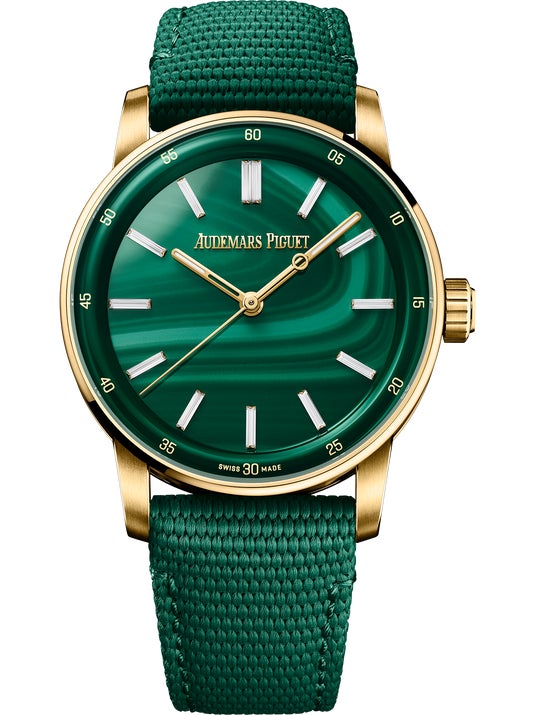 「CODE 11.59 バイ オーデマ ピゲ オートマティック」18Kイエローゴールドケース、ダイヤモンドのアワーマーカー、マラカイトダイヤル、41mm、価格要問合せ(日本限定モデル)