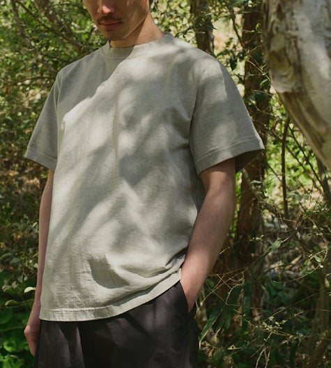 岐阜県の染色工場で、国内でも限られた現場で受け継がれているピグメントによる製品染めを施したカットソー。顔料(ピグメント)を繊維の表面に定着させることで、独特のムラや擦れ感が生まれ、長年着込んだような風合いに仕上がります。ブラック、ブルー、サンドベージュに加え、ホワイトにも顔料を重ねることで、ドライな質感を表現。顔料の層により透けにくくなるのも特徴です。