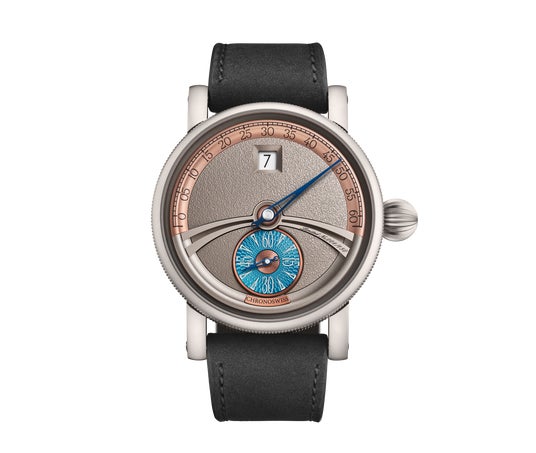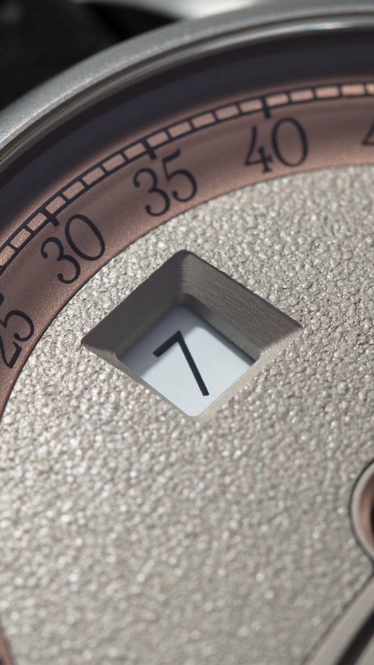 レトログラード分針: 中央の分針が扇形の目盛りを駆け抜け、端まで行くと瞬時にスタート地点へ戻る、躍動感あふれる動きを楽しめます。
