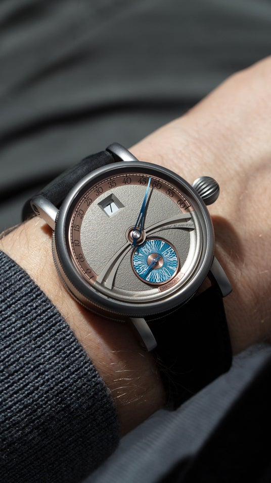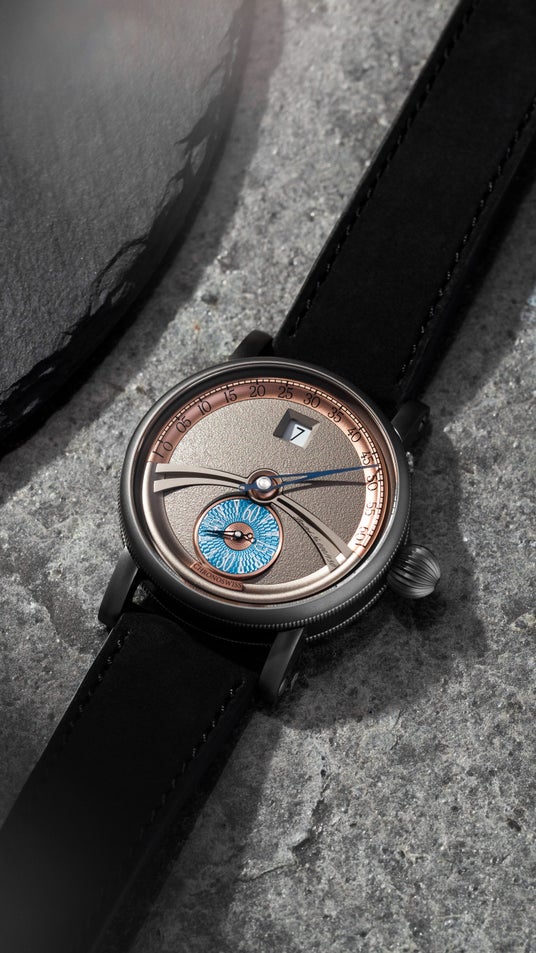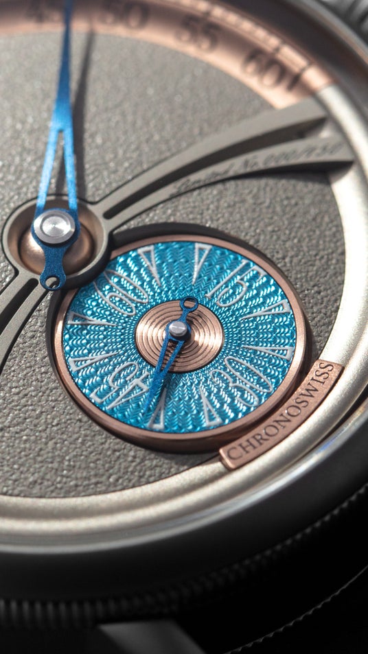 6時位置のスモールセコンドには、ルツェルンの工房で100年前の機械を使ったハンドギョーシェ彫りが施されています。その上に鮮やかな「アールデコ・ブルー」のラッカーが、デザインのアクセントになっています。 ゴールドプレートの分針リングが、落ち着いたグレーの文字盤に温かみのあるコントラストを添えています。
