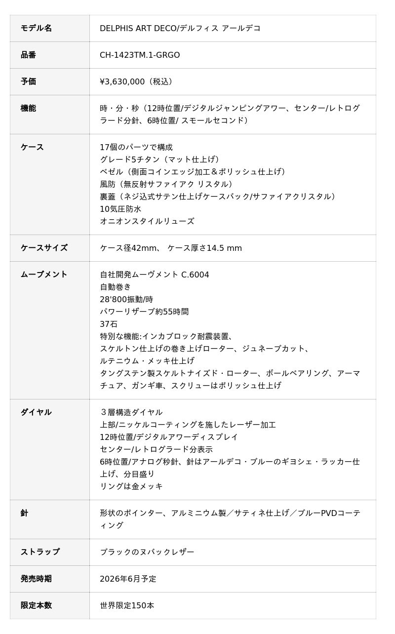 スイスの高級機械式時計ブランド「クロノスイス」は、最新作『DELPHIS ART DECO/デルフィス アールデコ』を全国の正規取扱店舗にて発売致します。