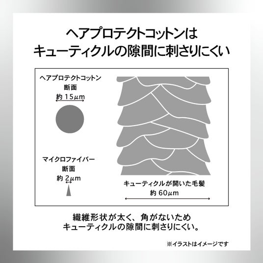 本商品には、ヘアプロテクトコットンを採用しています。繊維形状が太く、角がないため、キューティクルの隙間に刺さりにくく、髪を引っかけにくいのが特長です。これにより、タオルドライ時の摩擦を抑え、髪にやさしい使用感を実現しました。