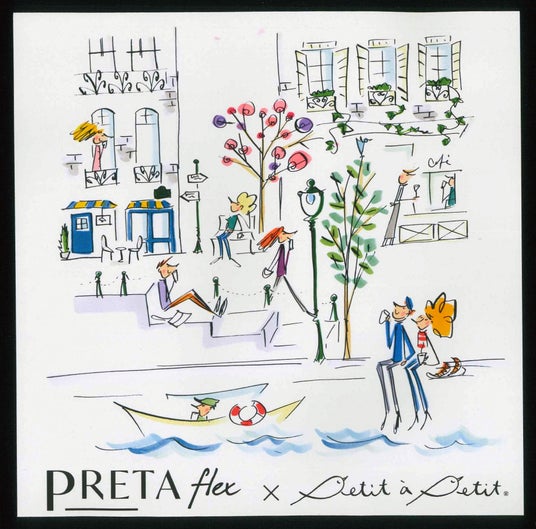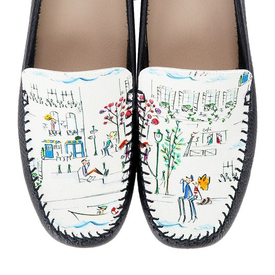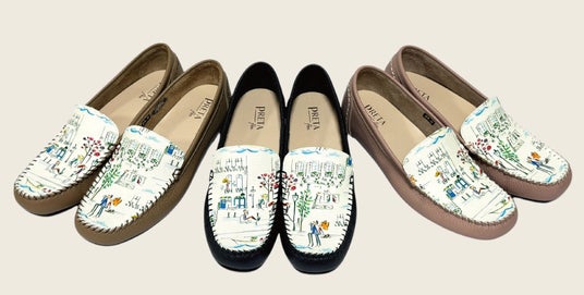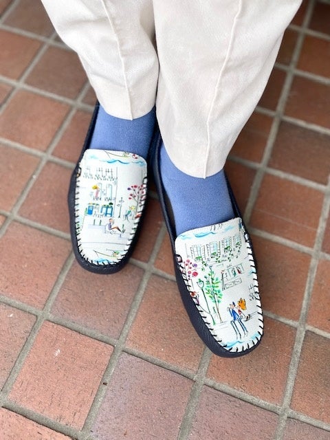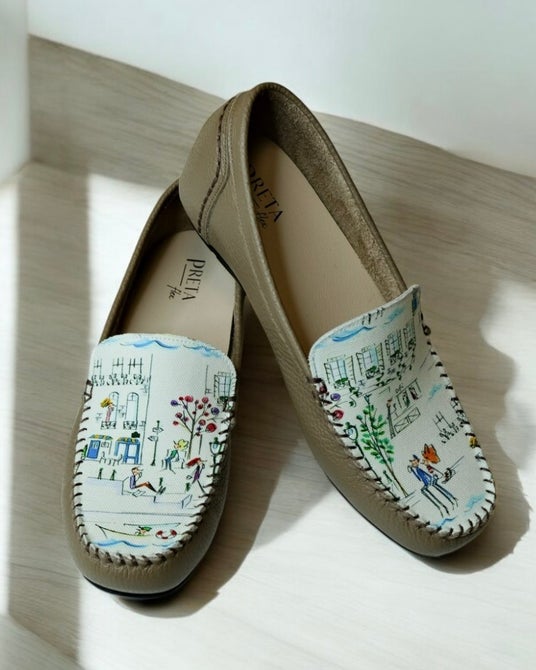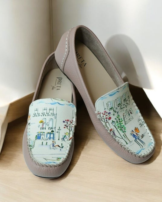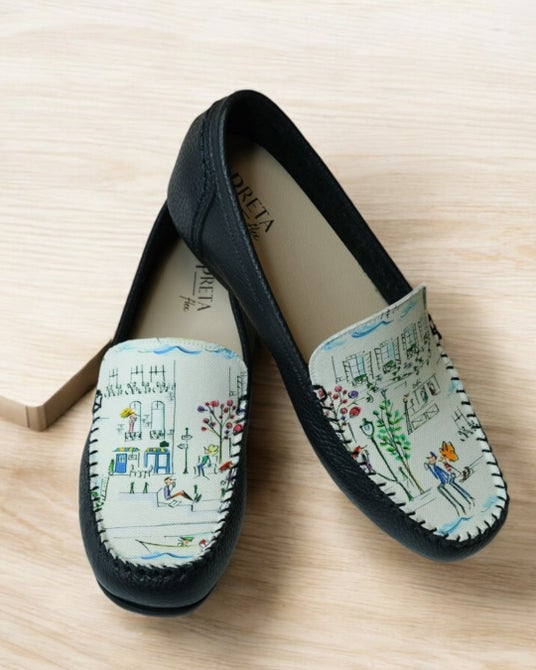 神戸のシューズブランド「PRETAflex(プレタフレックス)」は、京都在住のイラストレーター ナカムラユキさんが手がけるブランド「プティ・タ・プティ」とのコラボレーションによる限定モカシンを発売いたします。プティ・タ・プティさんのフランス・セーヌ川の日常を柔らかなタッチで描かれた、人気柄「セーヌ」を左右で一枚のイラストになる楽しさとともに甲にあしらい、神戸のくつ職人が一足づつ丁寧に仕上げました。