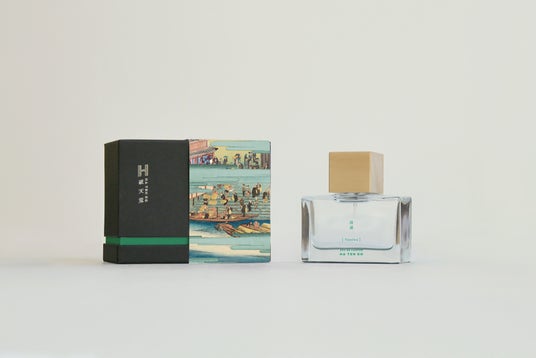 香水ボトルの包装紙は、かつて陶器輸出の緩衝材として使われた浮世絵を元にしたデザインです。紙を破ることでボトルが現れる仕組みにし、「破る」行為そのものを体験として取り入れています。