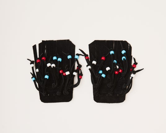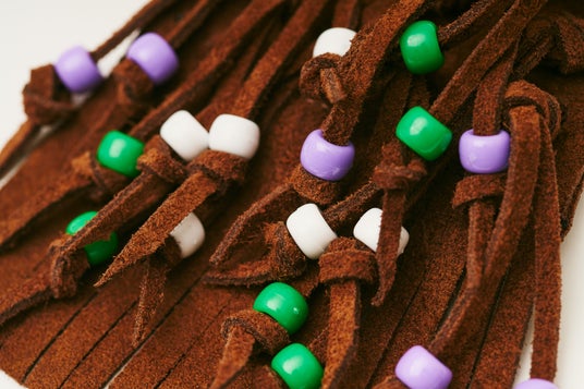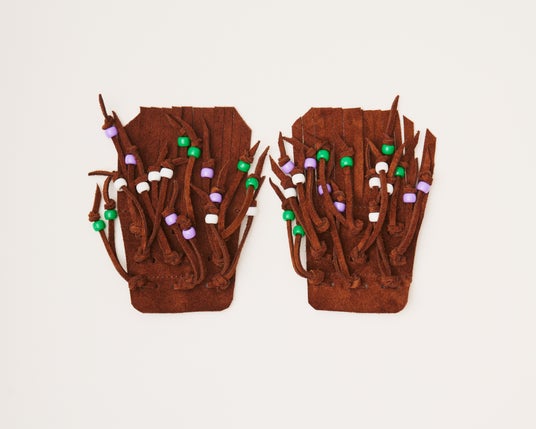 スエードの切り出しからビーズの取り付けまですべてハンドメイドにて制作。