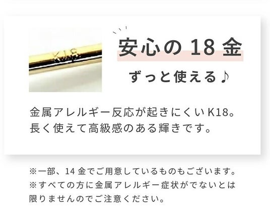 出来たばかりのピアスホールはとってもデリケート。だからこそ素材選びは慎重に!アレルギー反応が起こりにくい「18金」や「プラチナ」「ステンレス・チタン」などがセカンドピアスに適している素材です。(※すべての方にアレルギー症状が出ないとは限りませんので、ご注意ください)