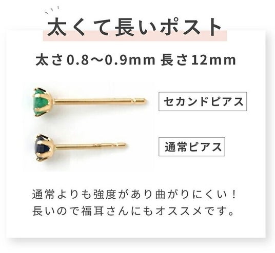 セカンドピアスのポスト(軸)の太さは、0.8mm~0.9mm、長さは12mmのものが多いとされています。