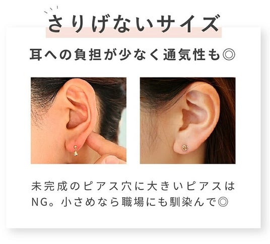 耳に負担のかからない、シンプルなデザインがおすすめ!大きすぎると引っ掛かりが気になるし、逆に小さすぎると穴に埋まって取れなくなってしまう可能性があります。