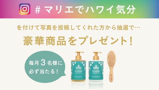 ハワイフェア期間中に、Malie Organicsの商品や店頭の様子をInstagramにご投稿していただいた方の中から抽選で、今年の新商品を毎月3名様にプレゼントいたします。
