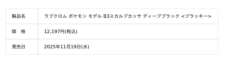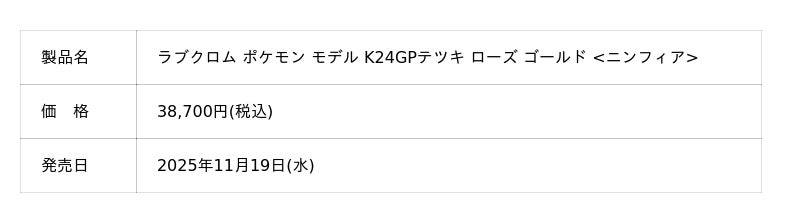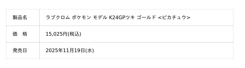新商品「ラブクロム ポケモン モデル K24GPツキ ゴールド <ピカチュウ>」、「ラブクロム ポケモン モデル K24GPテツキ ローズ ゴールド <ニンフィア>」、「ラブクロム ポケモン モデル B3スカルプカッサ ディープブラック <ブラッキー>」は、2025年11月19日(水)よりラブクロム直営店舗および公式オンラインストア、伊勢丹新宿店、阪急うめだ本店POPUP SHOPにて販売開始。