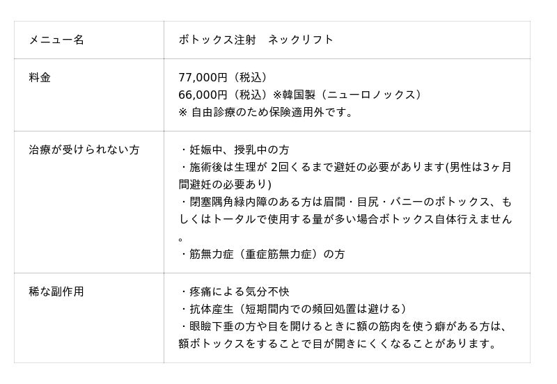 さらに、この度ボトックス注射より『ネックリフト』の提供を開始いたしましたので、ご案内いたします。