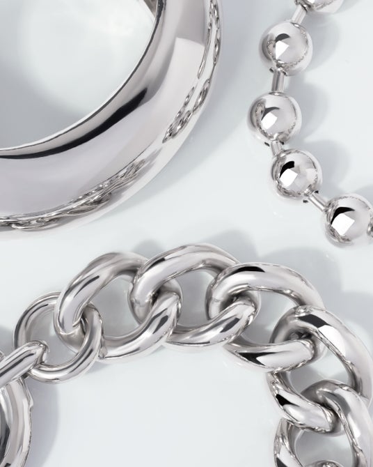 機能的なジュエリーパーツを拡張するようにデフォルメしたボリュームブレスレットや