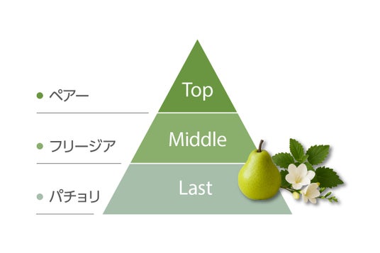 爽やかで甘さを抑えた洋梨とフリージアの香りを採用。自然体でいながら好印象を与えて、スタイルだけでなく気分まで軽くしてくれるような心地よい香りです。