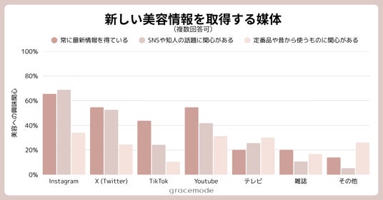 美容関心が高いユーザーにおいて、新しい美容情報の収集で使用する媒体はInstagramが最も高い結果となりました。次いでXが割合としては高くなっているものの、美容関心が最も高いユーザーにおいては、Instagramだけに限らず複数のSNSを活用した情報収集を行っている印象を受けます。