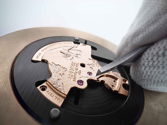 ケースバック側のムーブメントには、メゾンの工房で手作業によってすべて仕上げられた彫金が展開します。描かれているのは、大西洋を横断するブレゲXIX、1930年の正確な飛行経路、そしてヨーロッパと北アメリカ大陸の沿岸です。この沿岸にはジーブル加工(フロステッド加工)が施されています。
