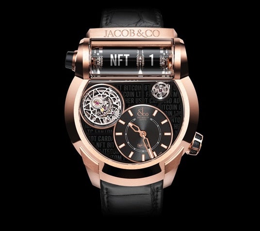 ジェイコブ&コーはNFT領域にも革新的な挑戦を行いました。2021年、世界初でありブランド初となるNFTウォッチ「SF24 Tourbillon NFT」を発表。実在する「Epic SF24」のワールドタイム機構とトゥールビヨンを3Dデジタル化し、世界初のNFTウォッチとして約100,000ドルで落札されました。特にフラップ式ディスプレイに仮想通貨銘柄が表示される演出は大きな話題を呼びました。このNFTは単なるデジタル資産ではなく、ブランド哲学やデザイン美学を新たな形で表現した“HELDAs(High-End Luxury Digital Assets)”の第一歩。物理とデジタルを融合した新たなコレクターズアイテムとして、次世代へジェイコブ&コーの世界観を発信しています。