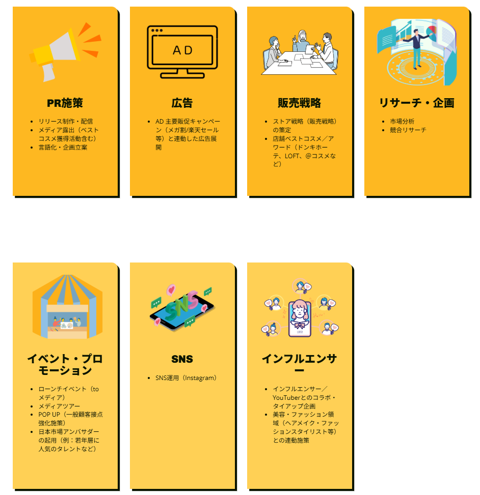 韓国美容・ファッションブランドの進出が加速する中、PACでは単なる輸入PRではなく、「日本の感性に響くブランド体験」を軸としたブランディング・マーケティング・PRサービスを展開。これにより、短期的な話題性ではなく、中長期的な“ファン”づくりへと繋げることが可能になります。クリエイティブ・PR・メディアタイアップ・POP-UPイベント・SNSやインフルエンサーを通じ、日本の生活者の“共感”と“購買”を生む、体験起点の戦略を立案します。