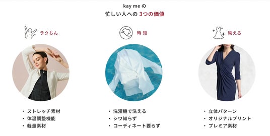 東京・銀座で創業した kay meは、ストレッチ性・防シワ性・洗濯機洗い可能な高機能素材を使用し「着心地はラクなのに、きちんと見える」ワンピースやスーツを展開しています。快適さと美しさを両立させた「課題解決型ファッション」として、多忙な女性たちの毎日をサポートしています。