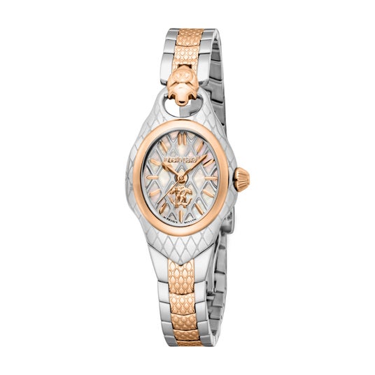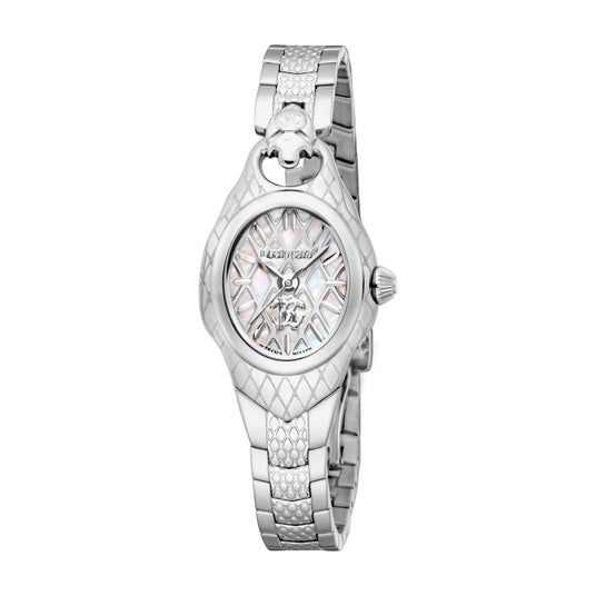 このロベルト・カヴァリ・バイ・フランク・ミュラーのスネーク・コア・ウォッチは、単なる時計ではありません--洗練された豪華さを大胆に表現した傑作です。 ケース上部に彫刻された蛇の頭部は、ブランドを象徴するモチーフとして圧倒的な存在感を放ち、身に着ける人の個性を際立たせます。 ブレスレットには優雅な蛇の模様が施され、マザーオブパールの文字盤と完璧に調和。 繊細な装飾が光を受けてきらめき、見る者を魅了します。