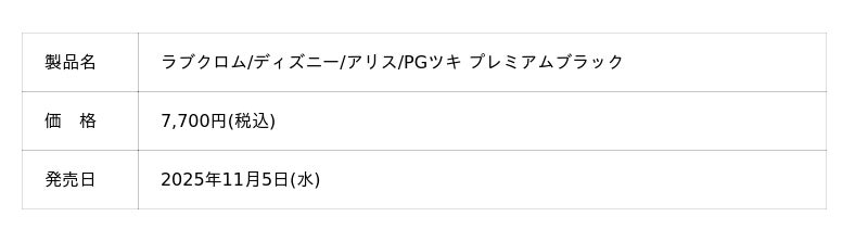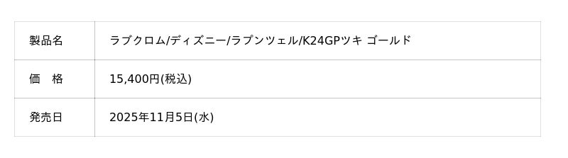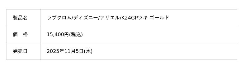 新商品「ラブクロム/ディズニー/ラプンツェル/K24GPツキ ゴールド」、「ラブクロム/ディズニー/アリエル/K24GPツキ ゴールド」、「ラブクロム/ディズニー/アリス/PGツキ プレミアムブラック」は、2025年11月5日(水)よりラブクロム直営店舗および公式オンラインストア、伊勢丹新宿店、阪急うめだ本店POPUP SHOPにて販売開始。