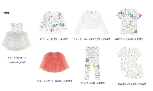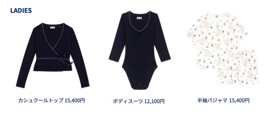 スウェット、Tシャツ、タンクトップ、レギンス、チュールスカート、カシュクールなど、バレエのエッセンスを取り入れたアイテムをラインアップ。水彩プリントはアンダーウェアやナイトウェアにも採用され、家族で楽しめるコレクションとなっています。