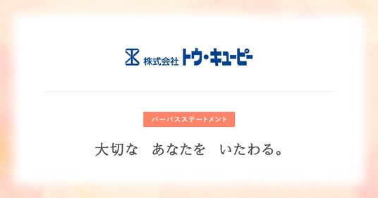 キユーピー株式会社のグループ会社で、キユーピーグループの公式通販ショップ「キユーピーウエルネス」を運営する株式会社トウ・キユーピー(本社:東京都渋谷区、代表取締役社長:谷川和正)は、このたび企業としてのパーパスステートメント「大切な あなたを いたわる。」を制定しました。