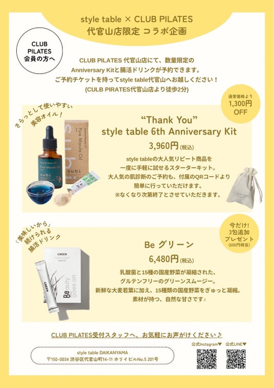 CLUB PILATES 代官山店にて、数量限定”Thank You” style table 6th Anniversary Kitとグリーンスムージーが予約できます。配布されたチケットを持ってstyle table 代官山本店へご来店され、グリーンスムージーをご購入された際には、3本追加でプレゼント致します。