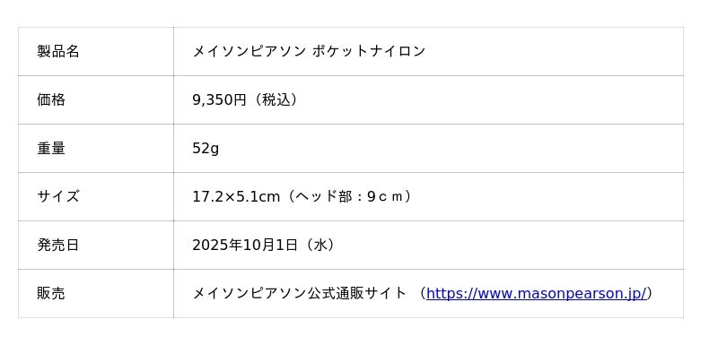 株式会社オズ・インターナショナル(本社:東京都中央区、社長:瀧澤泰盛)は2025年10月1日(水)に、英国製の高級ヘアブラシ「メイソンピアソン」の新モデル『メイソンピアソン ポケットナイロン』の日本での発売を開始いたします。本商品は当初、数量限定100本のみの特別なアイテムで、専用クリーナーとのスペシャルセットとしてお届けします※。
