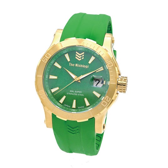 繊細な素材ゆえに加工が極めて困難とされますが、The Nishiogiの技術により極薄スライスによる天然ヒスイ文字盤を実現しました。