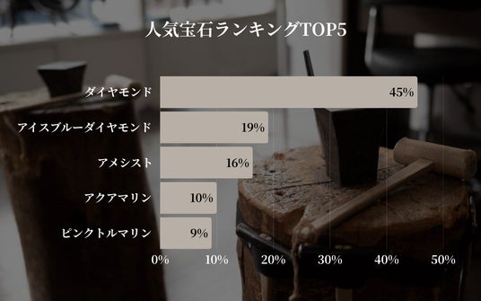 ダイヤモンド(45%)が圧倒的な人気を誇り、次いでアイスブルーダイヤモンド(19%)やアメシスト(16%)が選ばれていました。定番で高級感のある宝石への需要が高い一方、カラーストーンも一定の支持を得ています。