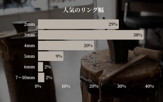 人気のリング幅は3mm(38%)と2mm(29%)で、細身のデザインが好まれていることが分かりました。4mm以上の幅はあまり選ばれておらず、2月は太めのリングは需要が低い傾向にありました。