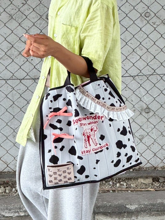 KNT365の代表的なバック、「Knitty」でも編地をふんだんに使用したアップサイクル作品が展開。