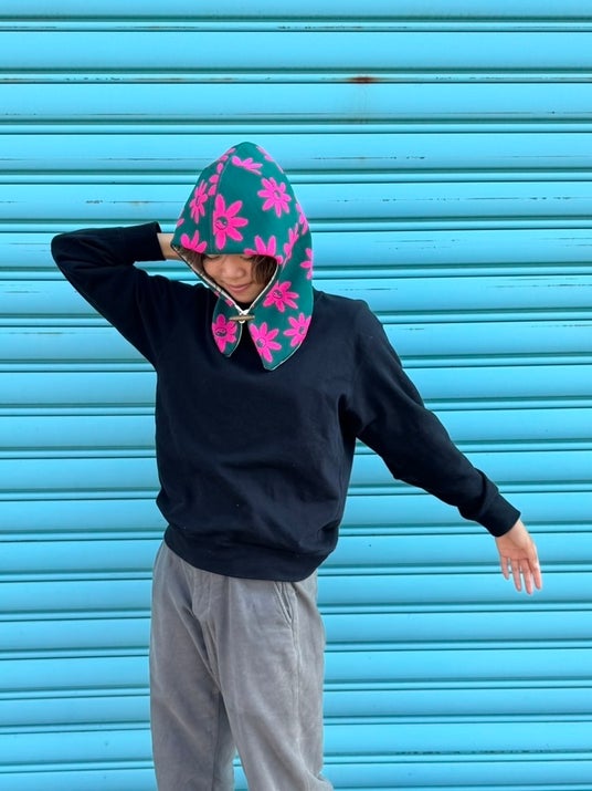 首まで覆われており、ファッションとしても、これからの寒い季節には防寒対策にもなる作品です。