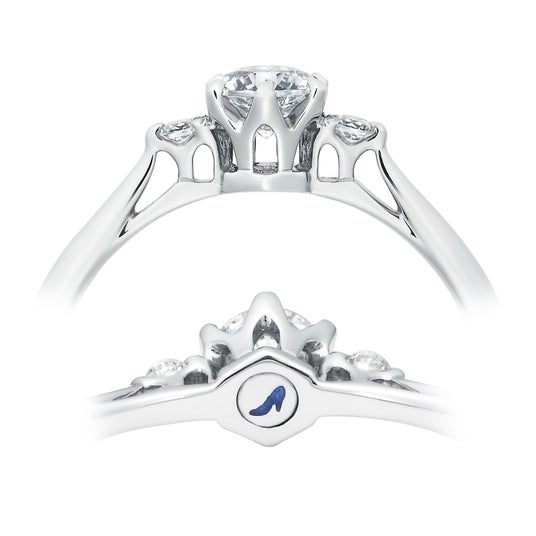 エンゲージリングは、シンデレラ城の建築造形をイメージし、柱が立っているかのようにデザインされた石座側面の美しさが魅力です。12時の鐘が鳴り響く中、シンデレラが駆け下りるお城の階段や、ドレスがなびく様子を表現したマリッジリングも華やかです。