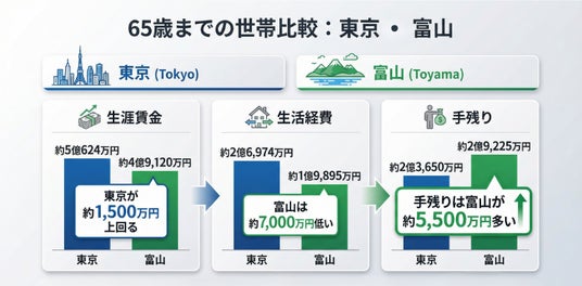 世帯ベースで「65歳まで」を想定して東京と富山を比較すると、生涯賃金の総額は東京が約5億624万円、富山が約4億9,120万円で、賃金面では東京が約1,500万円上回ります。