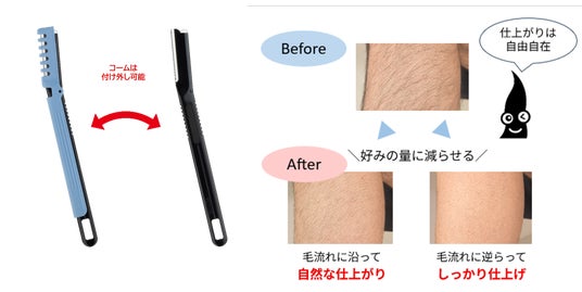 【Point 2】 好みの量に減らせるコームが付いたカミソリでなでるだけで、毛量を適度に減らして自然な状態に仕上げられます。