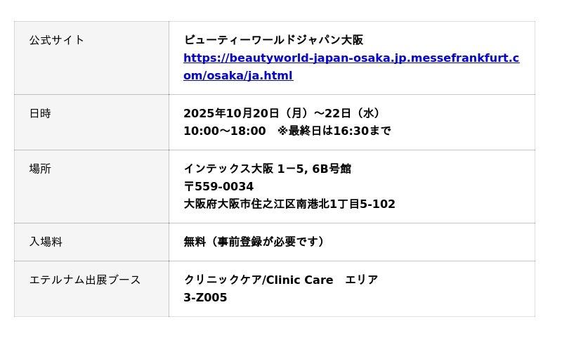 2025年10月20日~22日@インテックス大阪で開催。西日本最大級の総合ビューティ見本市「ビューティーワールドジャパン大阪」にて、医療機関専売品「エテルナムDR」の体験・商談・購入が可能!