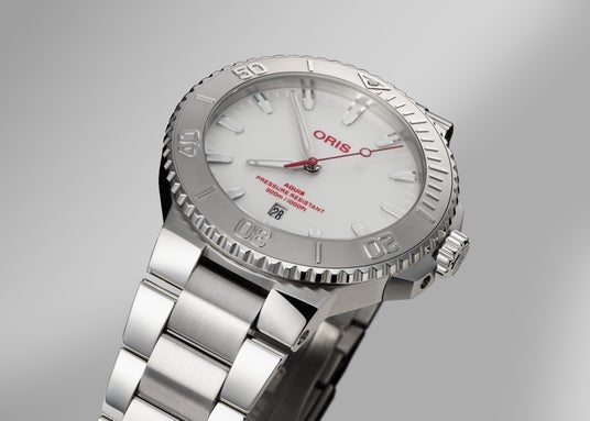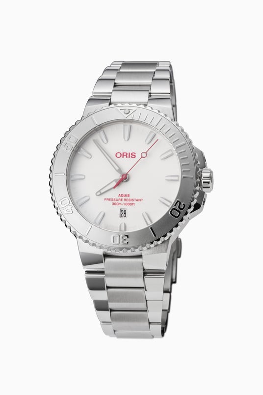 オリスの中でもベストセラーのアクイスコレクション。中でも日本で特に人気の「アクイス デイト レリーフ」をベースにした日本限定モデルは、洗練されたホワイトダイヤルに鮮やかなレッドのロゴと秒針を配置した美しいデザインを特徴とします。