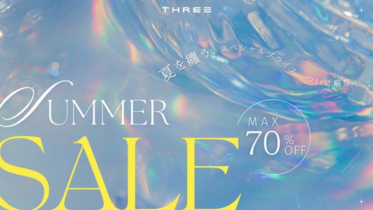 日頃のご愛顧に感謝の気持ちを込めて、THREEでは、今年もサマーセールを開催いたします。夏を心地よく過ごせるアイテムがMAX 70%offでGETできるチャンスをお見逃しなく。