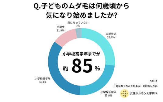 実施したアンケート調査では、子どものムダ毛について「気になったことがある」と回答した母親は半数以上にのぼりました。また、子どもがムダ毛を意識し始めた時期については、「小学校低学年」が23.9%、「小学校高学年」が34.3%となり、小学生までに約85%の子どもが体毛を意識し始めていることが明らかになり、毛の悩みが若年齢化していることがわかります。