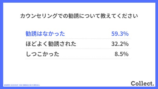 - カウンセリング時の勧誘は「なかった(59.3%)」が過半数。しつこい勧誘は1割以下