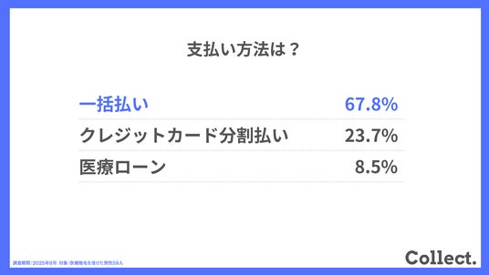 - 支払い方法は「一括払い(67.8%)」が主流。分割払いや医療ローンは少数派