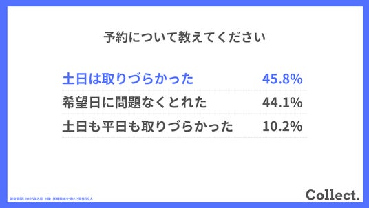 - 予約は「土日は取りづらい(45.8%)」が最多。「希望日に問題なく取れた(44.1%)」と拮抗