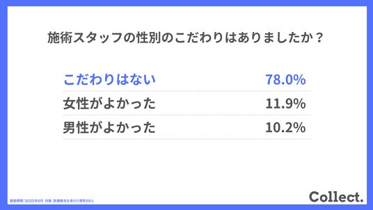 「こだわりはない(78.0%)」が圧倒的多数で、性別よりも施術の技術や結果を重視する傾向が見られました。