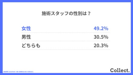 「女性(49.2%)」が最も多く、「男性(30.5%)」「どちらも(20.3%)」と続きました。メンズ医療脱毛では施術するスタッフの性別に大きな偏りはないようです。