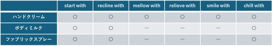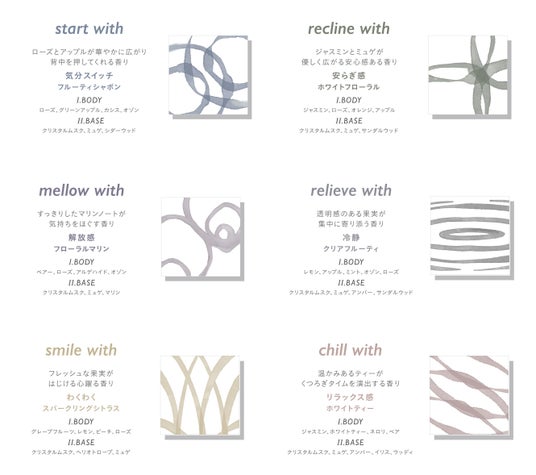 香りは全部で6種類。“誰かと共に過ごす時間” の中に自然と溶け込む香りを目指しました。それぞれの香り名の最後には「with」という単語を付け、“誰かと一緒に過ごす時間に寄り添う香りであって欲しい” という願いを込めています。